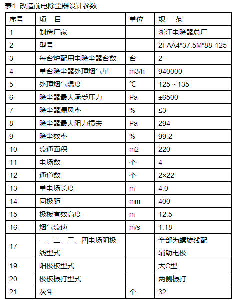 改造前,本工程配套兩臺浙江電除塵器總廠(即現在菲達環保)生產的2FAA4*37.5M*88-125型雙室四電場臥式除塵器,電除塵控制部份采用福建龍巖空氣凈化設備廠生產的GGAF02-1.0/72H型產品,設計除塵效率≥99.2%,極板型式為大C型板,極線型式為全部為螺旋線配輔助電極,出口設槽極板,振打方式全部采用側部饒臂錘振打。其一、二、三、四電場高壓供電和控制裝置是GGAJ02-1.0/72CG型的整流變壓器。本工程改造前電除塵器設計參數見表1。