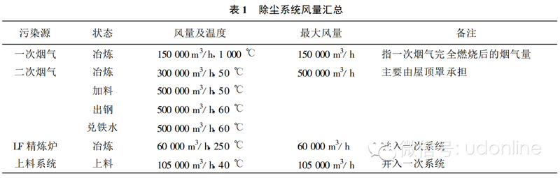 5) 除塵系統(tǒng)風(fēng)量匯總:除塵系統(tǒng)風(fēng)量匯總見表1。